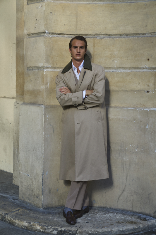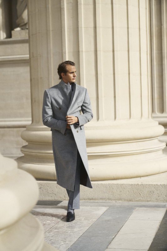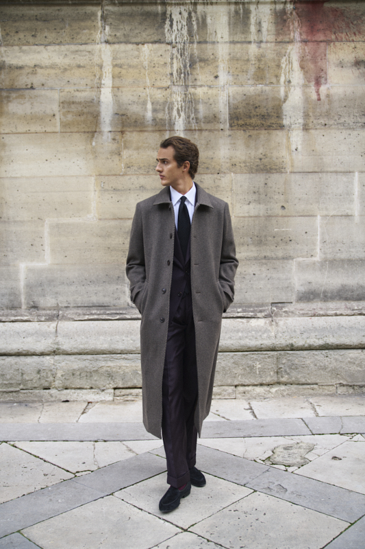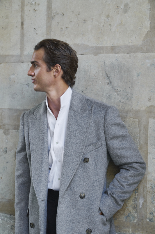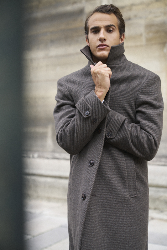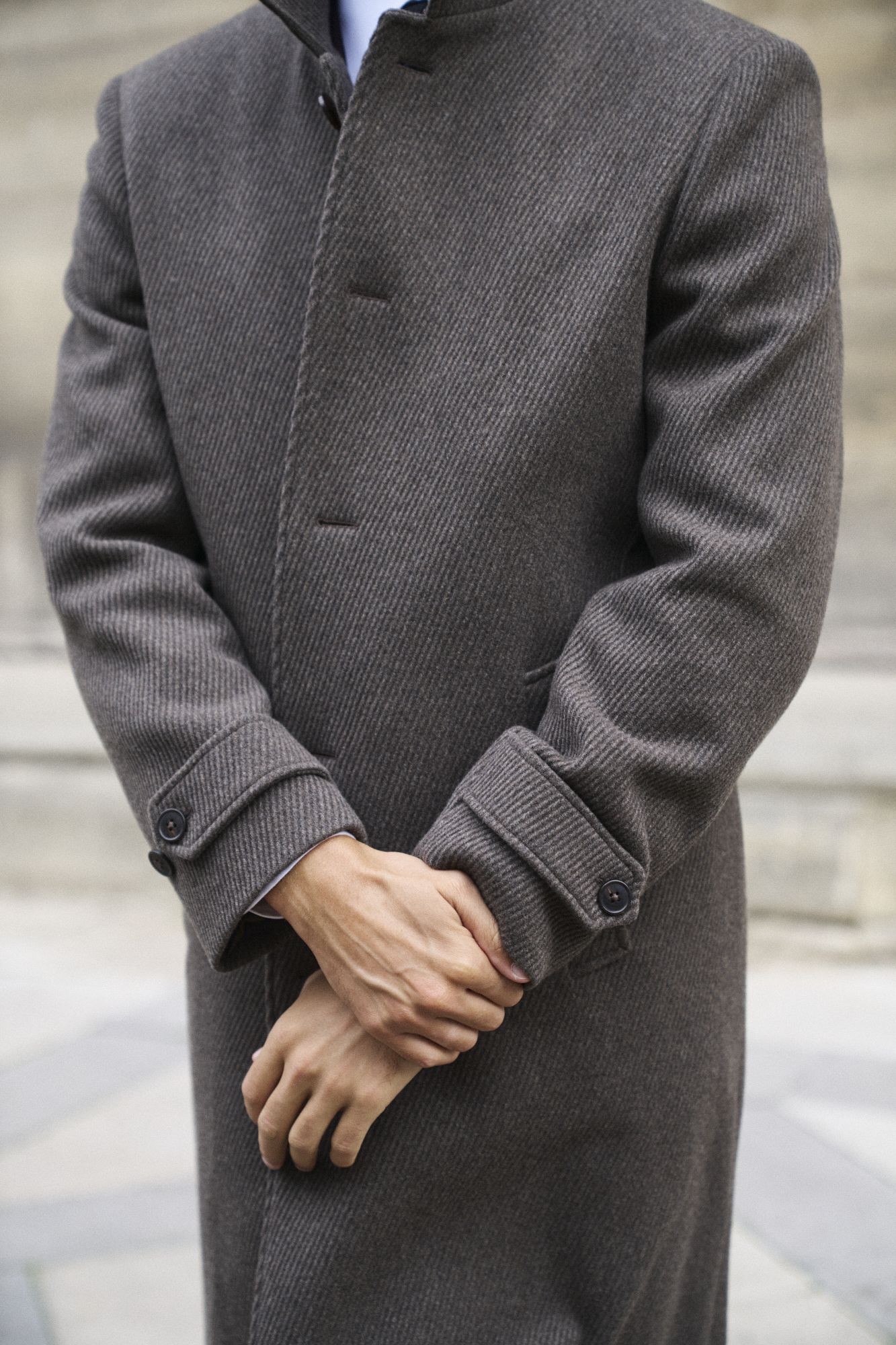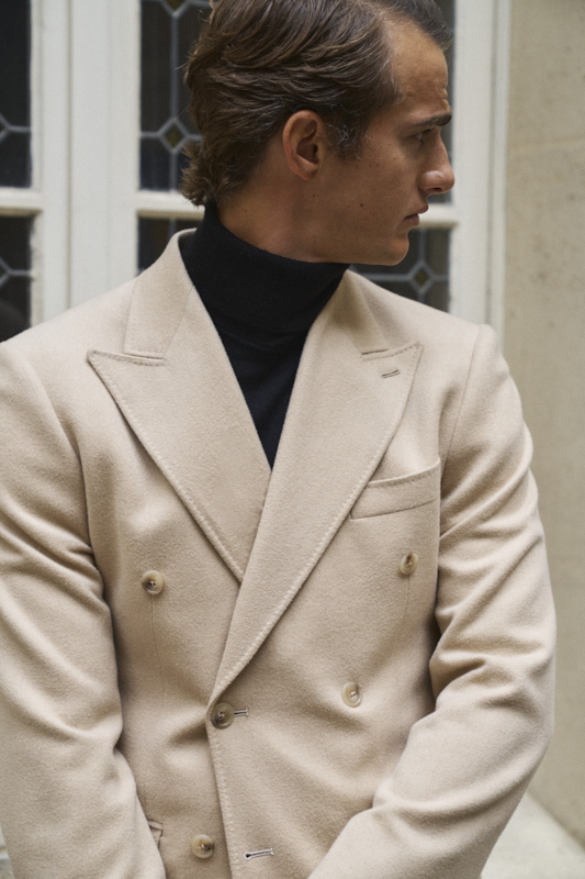 Modèle 1 : Manteau long croisé 6x2 en Alpaga de la maison Fratelli Tallia di Delfino.