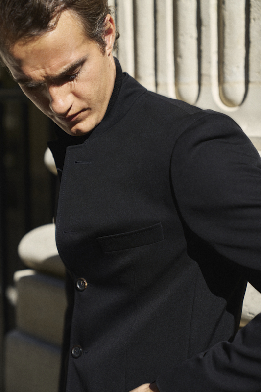 Modèle 5 : Veste d'officier droite réalisée en SuperGabardine Noire de chez Hardy Minnis.